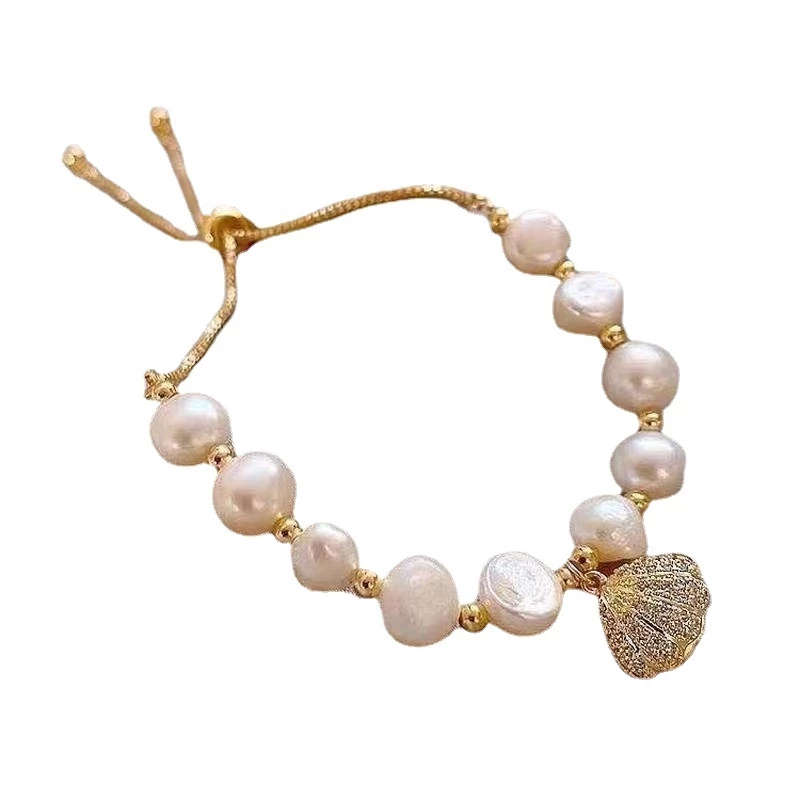 Elevate your elegance with the Golden Tide Pearl Bracelet, featuring luminous freshwater pearls accented with gold beads and a sparkling seashell charm an exquisite blend of ocean-inspired grace and modern luxury.