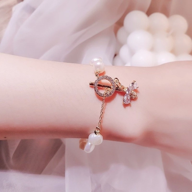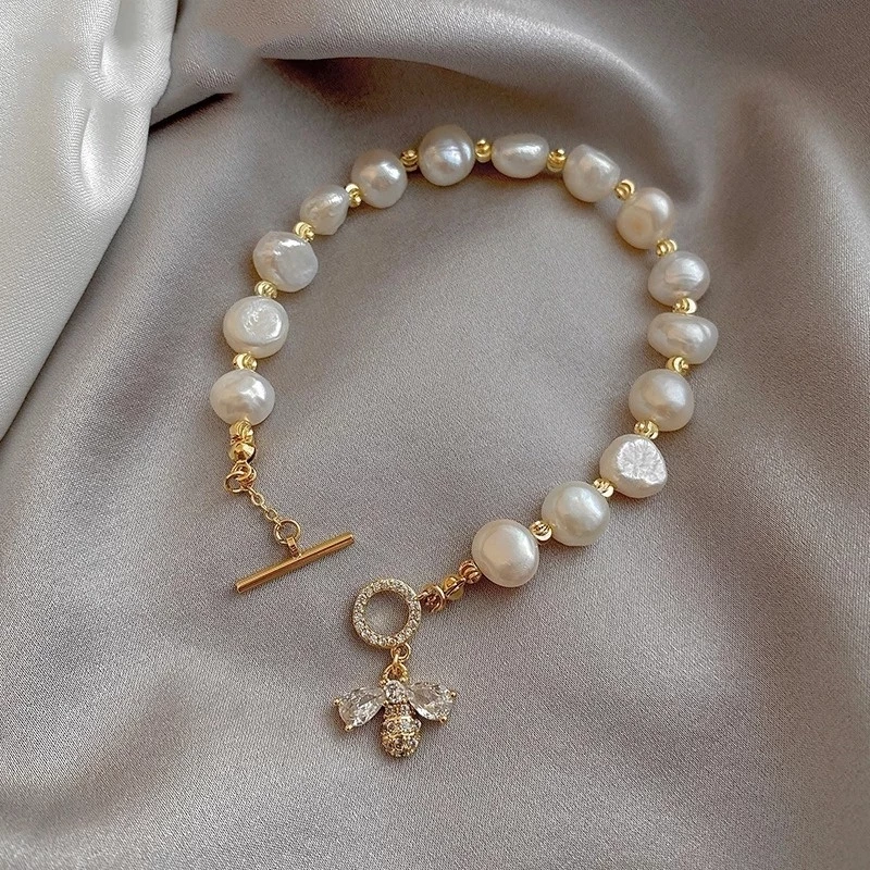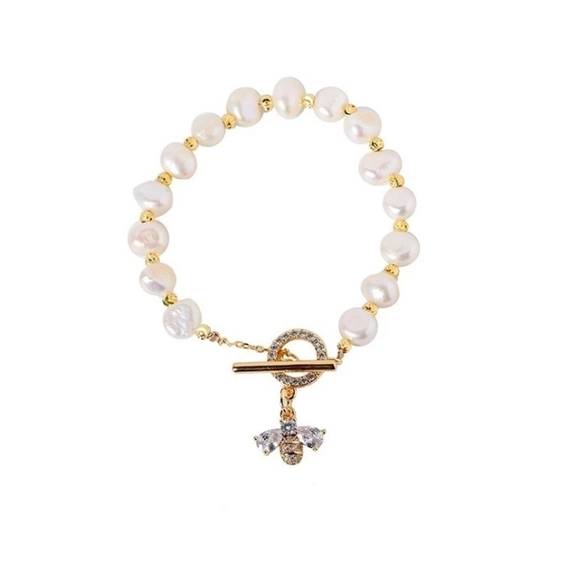 Adorn your wrist with the Honey Luxe Pearl Bracelet, a radiant blend of natural freshwater pearls, gleaming gold accents, and a dazzling crystal-studded bee charm perfect for adding a sweet touch of sophistication to any outfit.