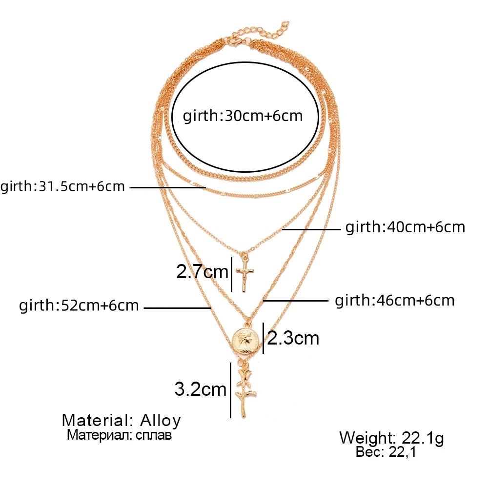 This necklace is made of an alloy and features a multi-layer design with a golden cross pendant, elegant round pendants, and a large engraved pendant. It is lightweight, comes individually packaged, and is intended for fashion-forward women.