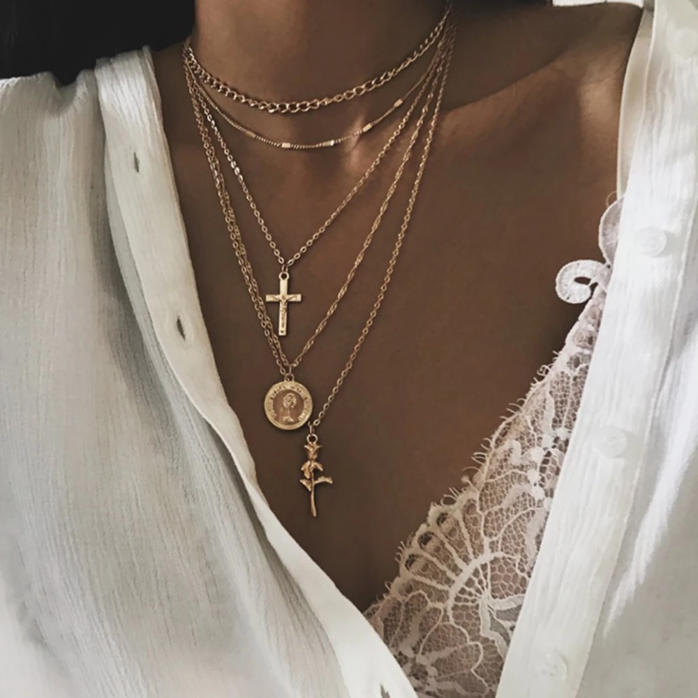 Layered Gold Cross Necklace – Multi Chain Choker Jewelry for Women
